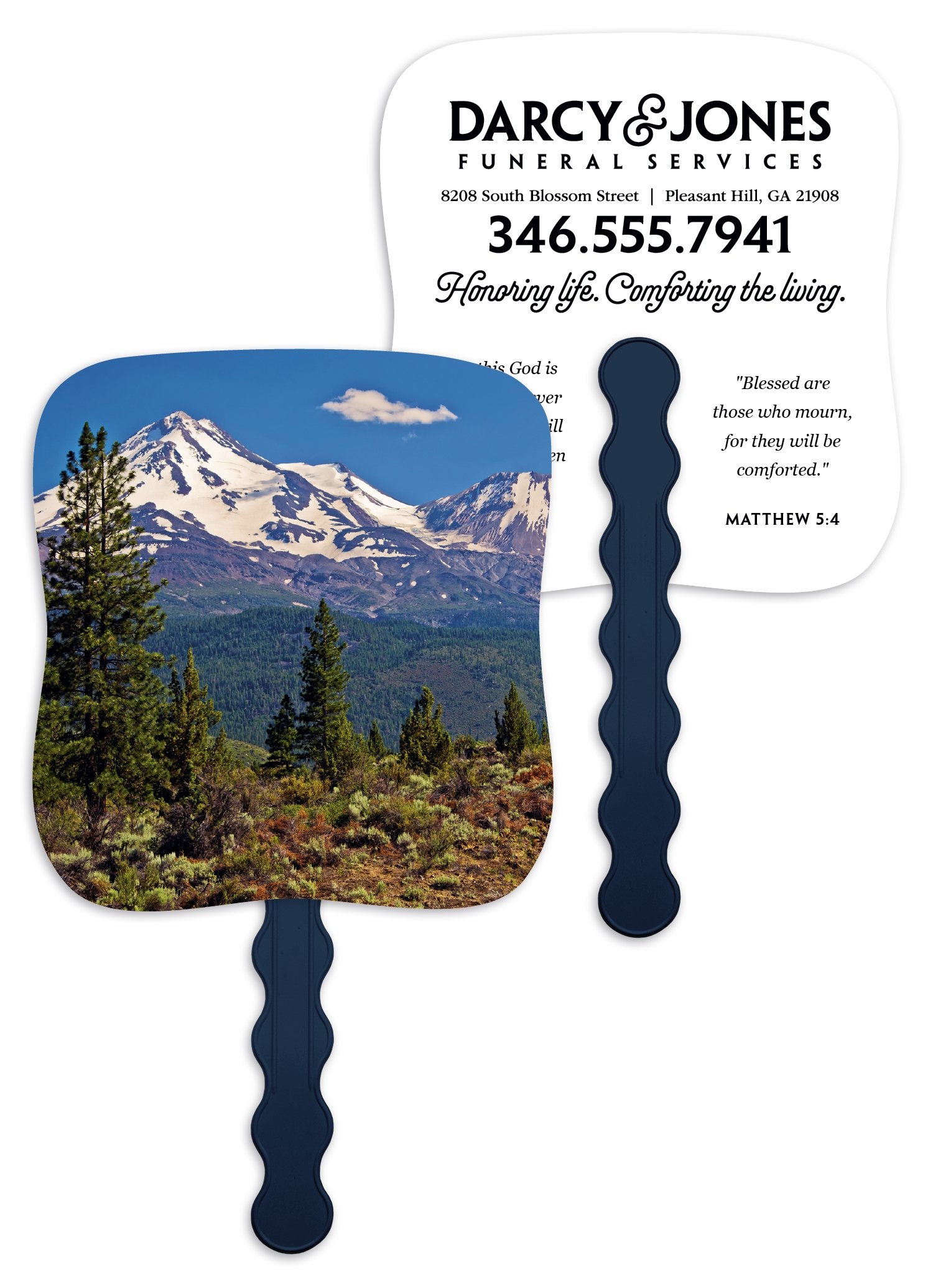 Stay cool and spread your message with this beautifully designed hand-held paper fan featuring an uplifting image on the front and your imprint on the back. Perfect for so many occasions, it combines practicality with a meaningful message, adding elegance to your event while keeping attendees feeling refreshed. The FSC® label means that the materials used for this product come from well-managed FSC®-certified forests and other controlled sources.