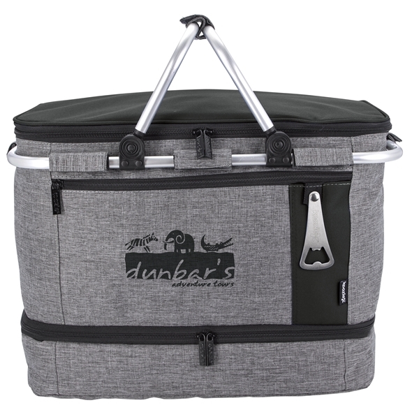 The large, lightweight Koozie® Collapsible Jumbo Picnic Basket is perfect for bigger groups. An excellent choice for tailgating, it comes equipped with an attached bottle opener, a front zippered compartment for snacks or valuables, and two other compartments with heat-sealed PEVA lining. The bottom compartment is ideal for storing a casserole dish or a blanket. When the fun is done, this picnic basket collapses for easy storage.