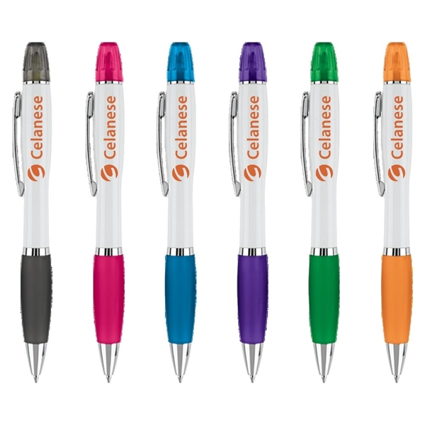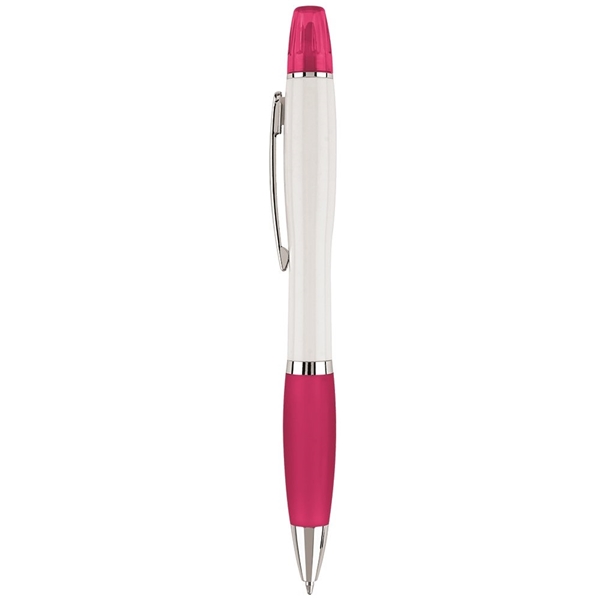 Twist-action ballpoint pen.Curvaceous glossy white barrel with translucent color rubber grip and matching highlighter cap.