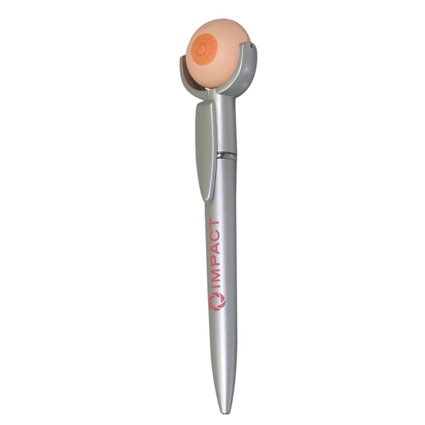 - A mini breast shaped Squeezies® stress reliever sits atop this ballpoint pen.