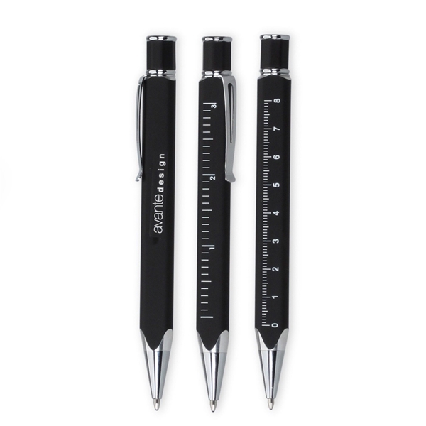 - Twist-action metal ballpoint pen ruler with inches and centimeters and silvertone points.
