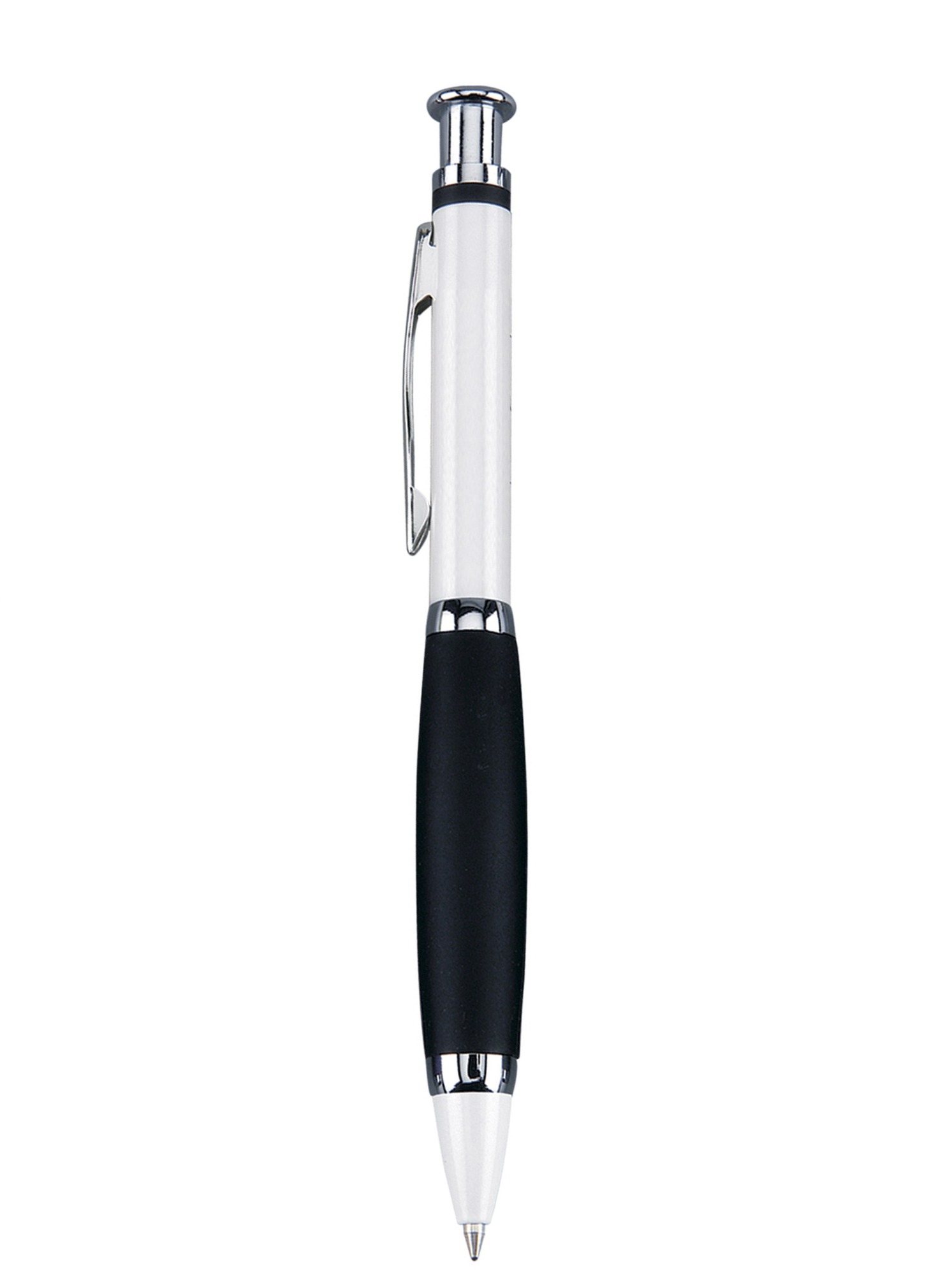About this Blackpen Brass Click - Action White Ballpoint Pen w / Black Comfort Grip, Chrome Points: