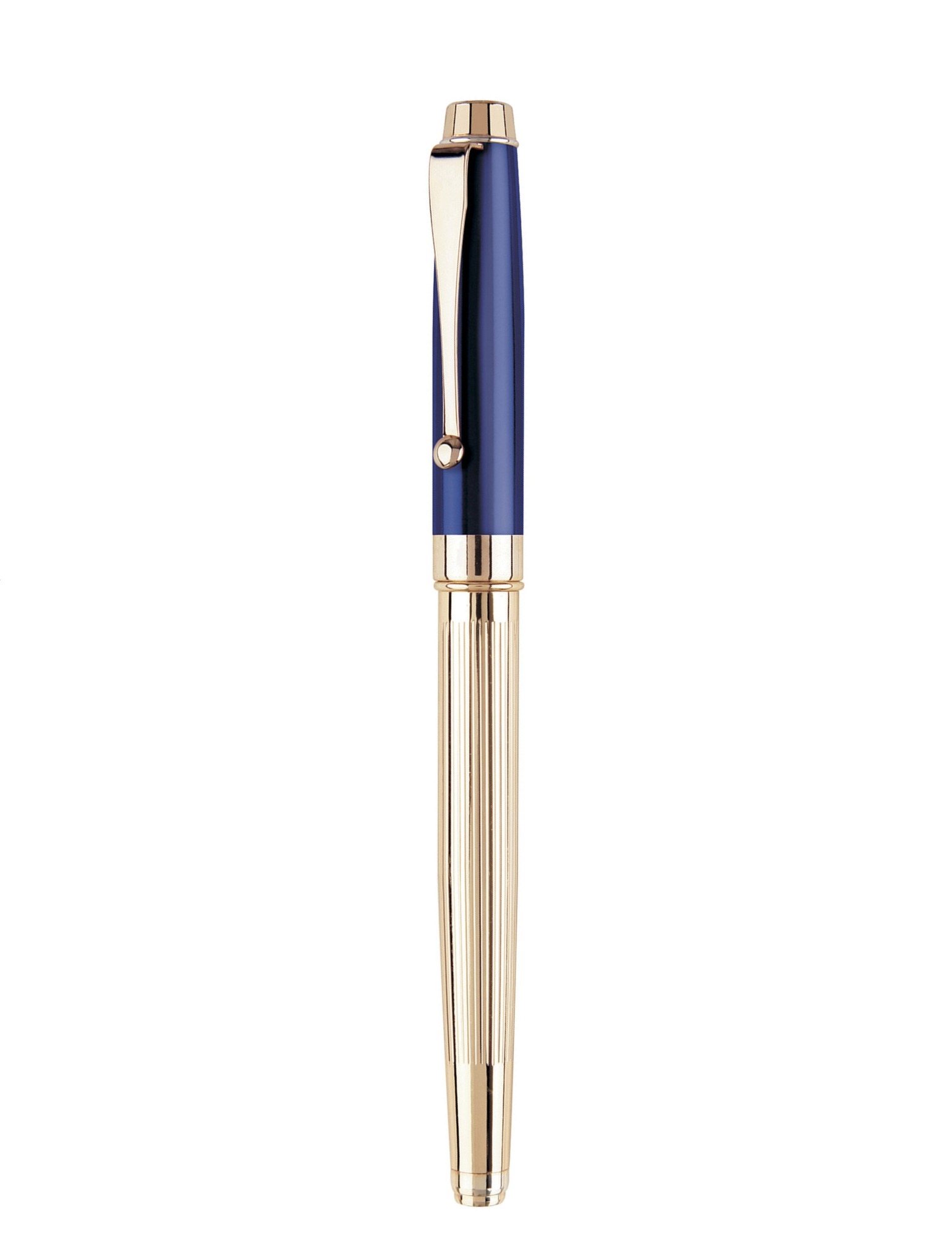 - Polished gold with blue translucent lacquer finish and fluted barrel.