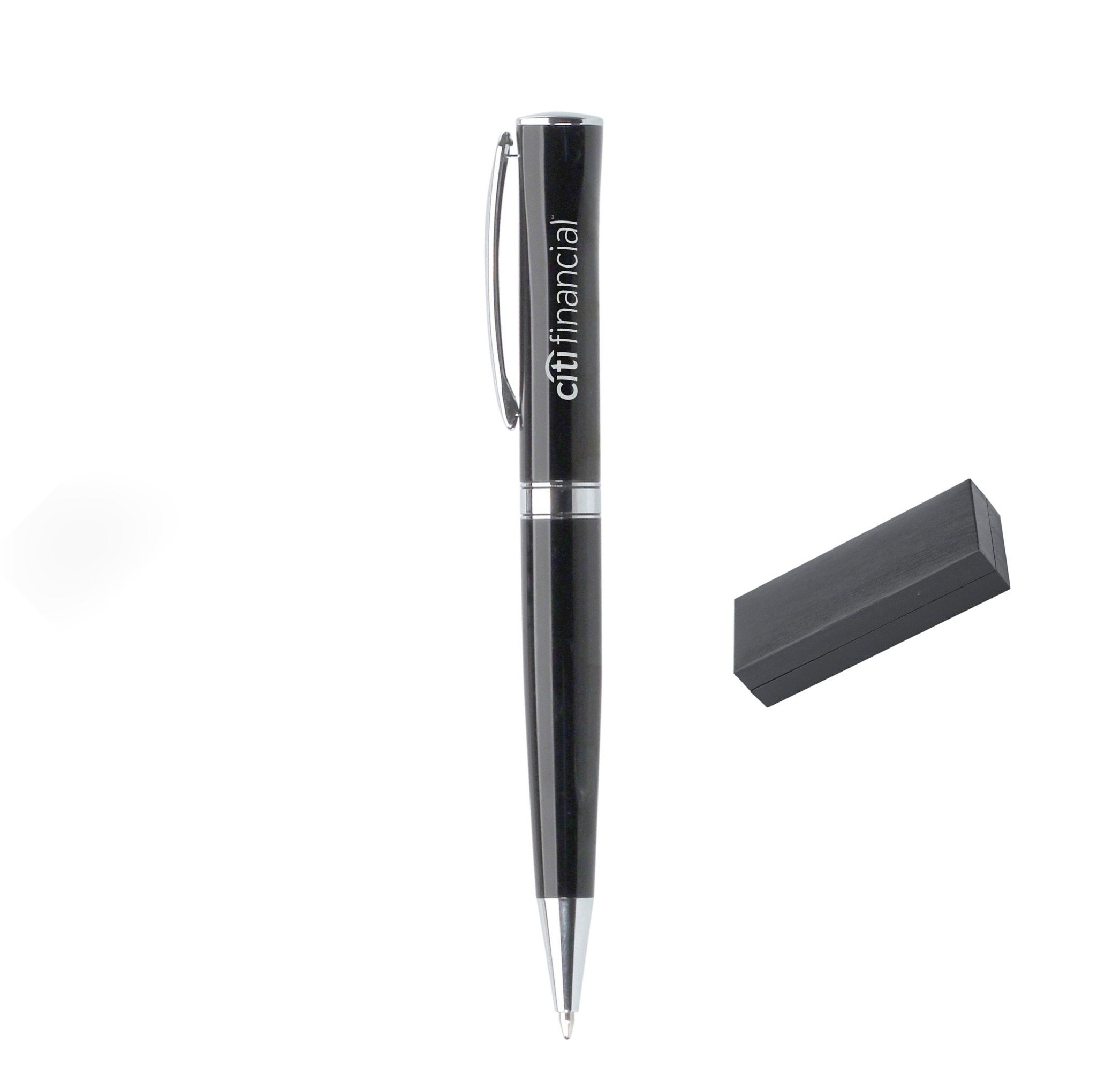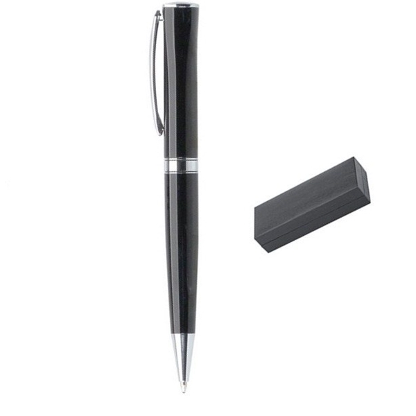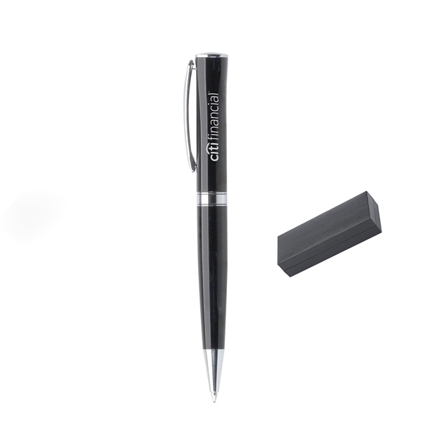 - The twist-action ballpoint pen with black lacquer finish, flat top, and silvertone points exudes sophistication and elegance.