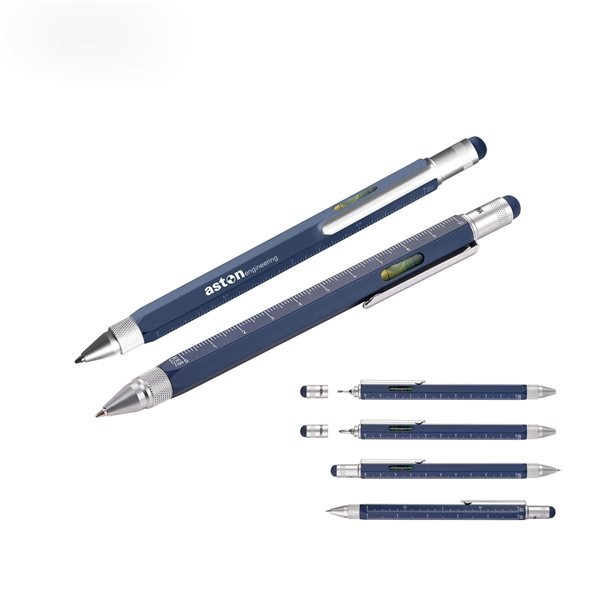 Multifunction blue brass ballpoint pen with 4 different metric ratios (1:20, 1:50, 1:100, 1: 1 inch), level, Phillips and slotted screwdriver and stylus.