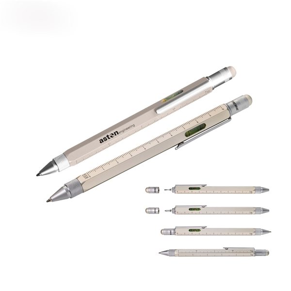 Multifunction gold brass ballpoint pen with 4 different metric ratios (1:20, 1:50, 1:100, 1: 1 inch), level, Phillips and slotted screwdriver and stylus.
