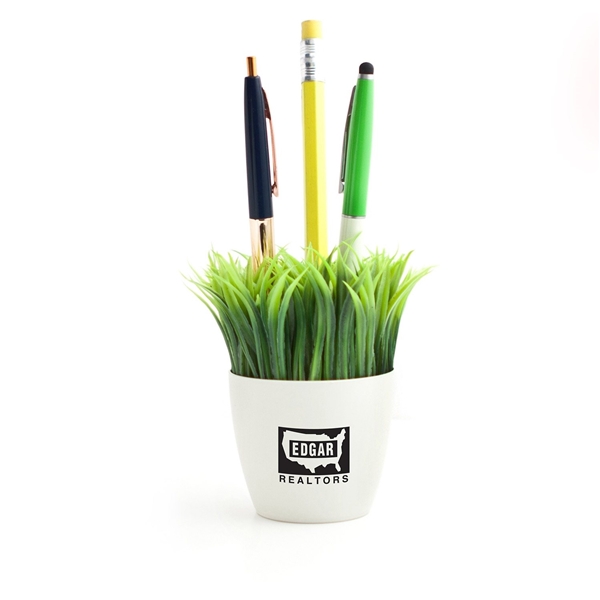 Pen and pencil holder with faux grass in a plastic pot.