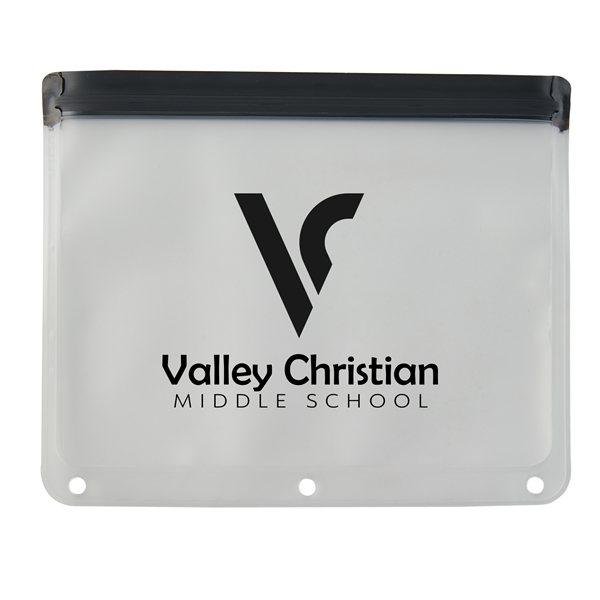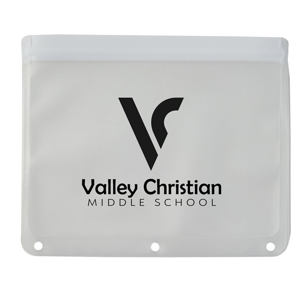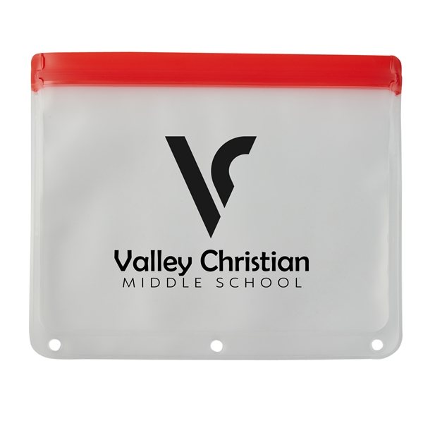 Pouch stores multiple pencils, pens, eraser, and other school supplies