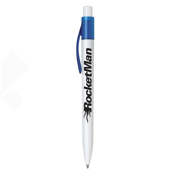 Click action plastic pen with translucent wide pocket clip and solid white barrel.