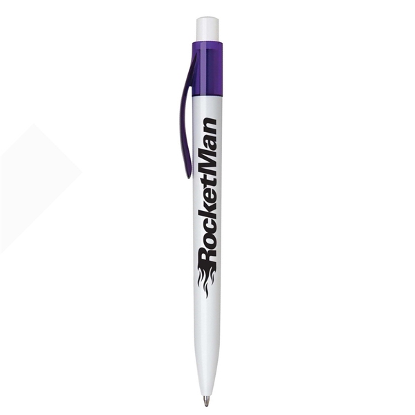 Click action plastic pen with translucent wide pocket clip and solid white barrel.