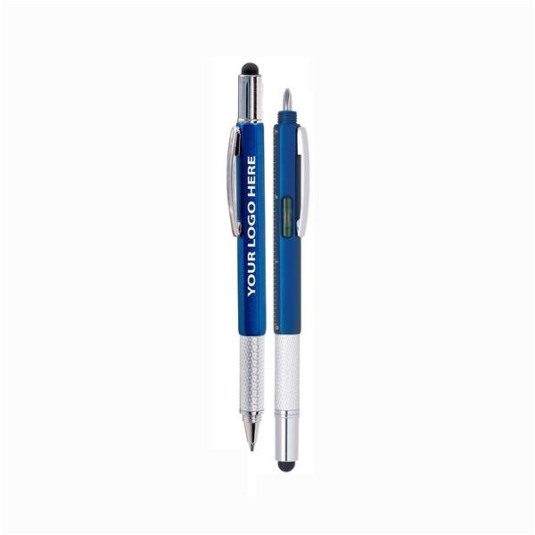 Multifunctional twist-action metal pen with stylus, ruler, screwdriver and level tool set