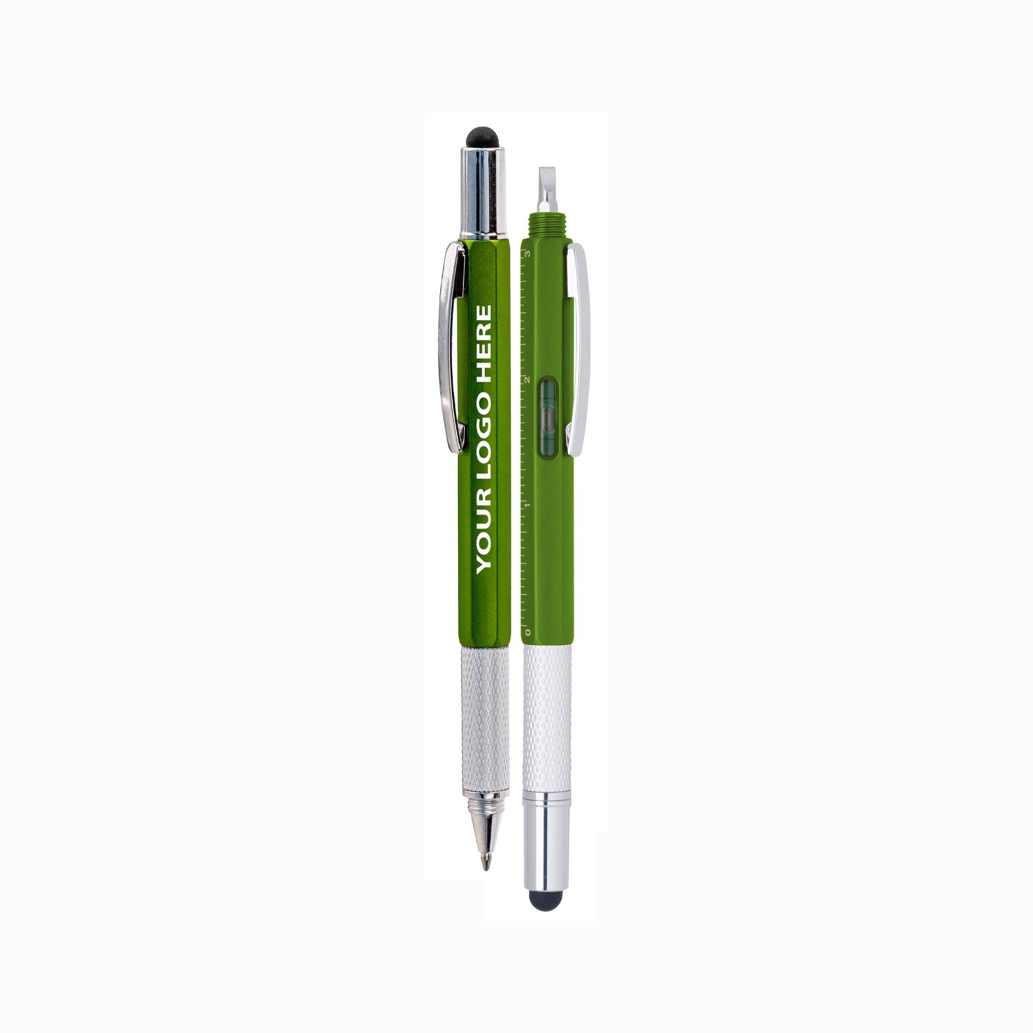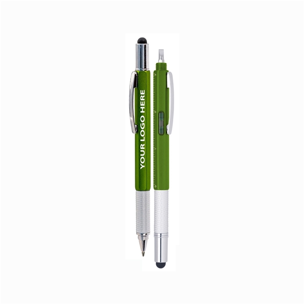 Multifunctional twist-action metal pen with stylus, ruler, screwdriver and level tool set