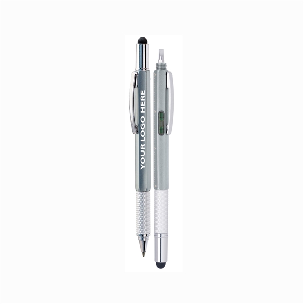 Multifunctional twist-action metal pen with stylus, ruler, screwdriver and level tool set