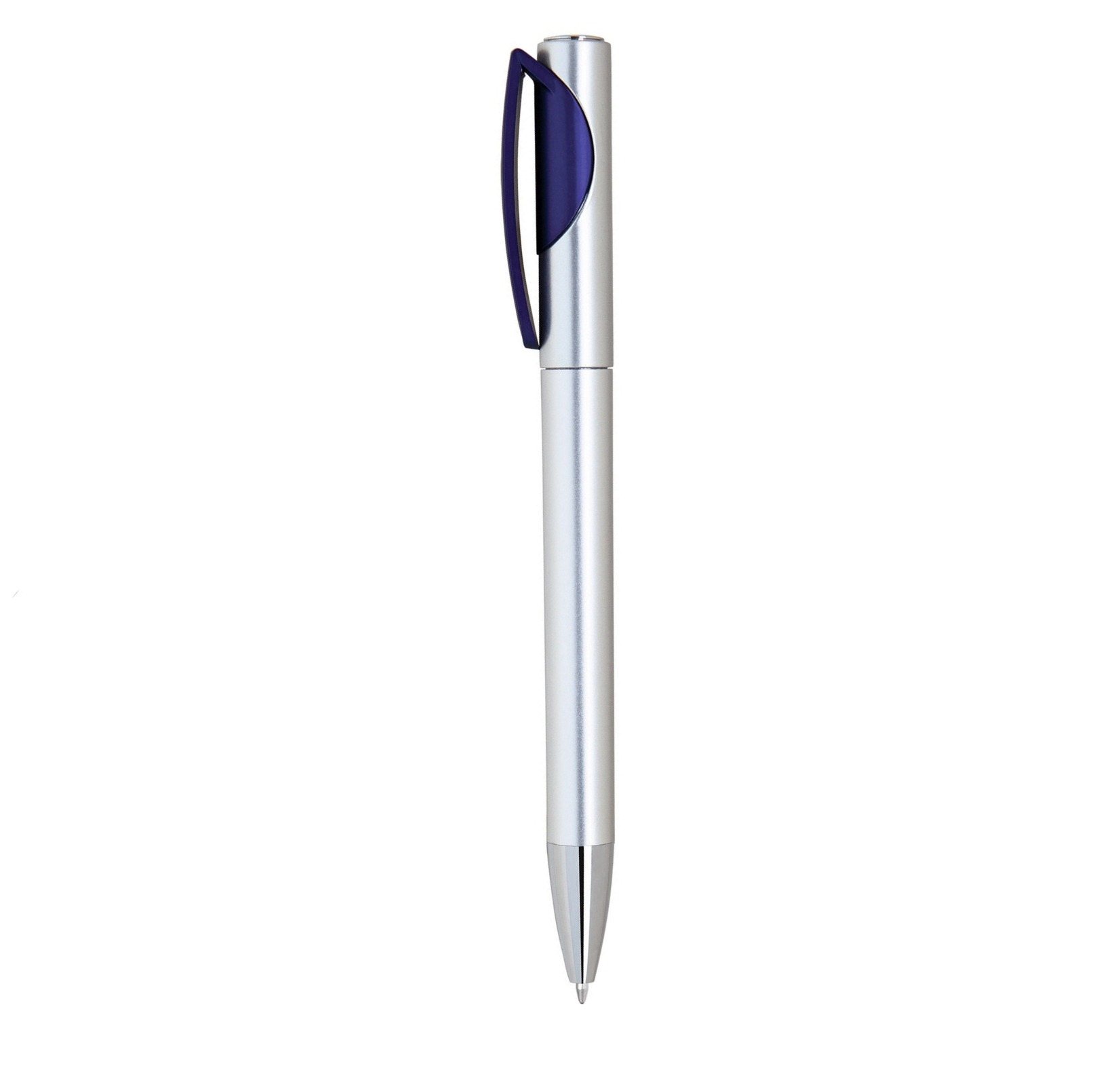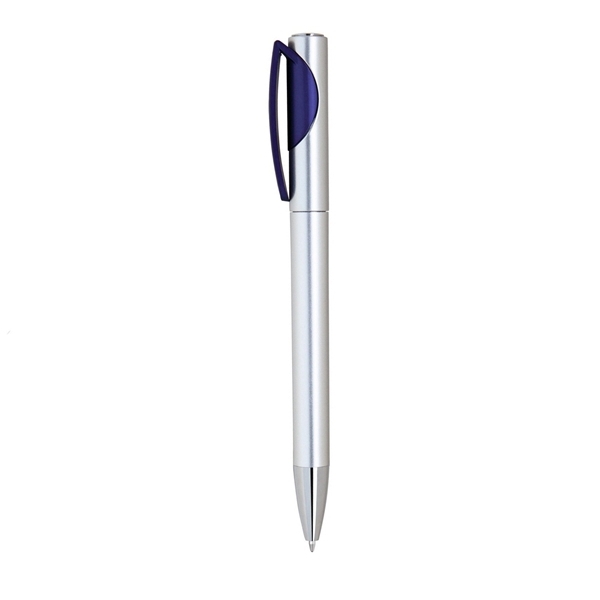 Economical plastic pen in silver with colored trim on clip.