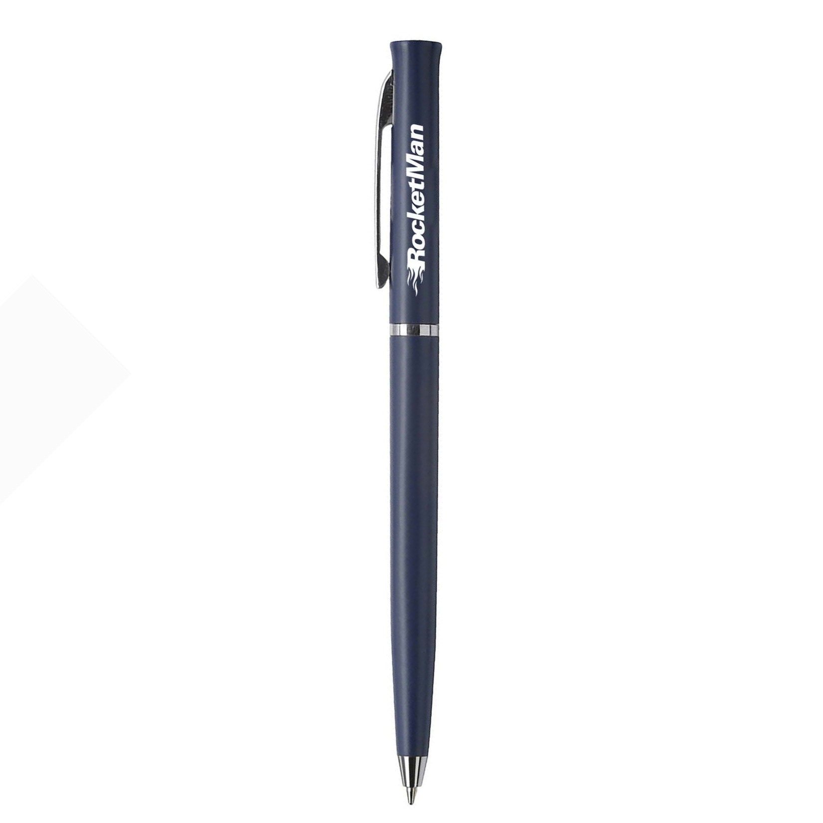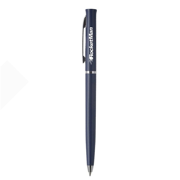 Ultra slim twist-action plastic ballpoint pen with solid opaque color, stainless steel tip and clip.