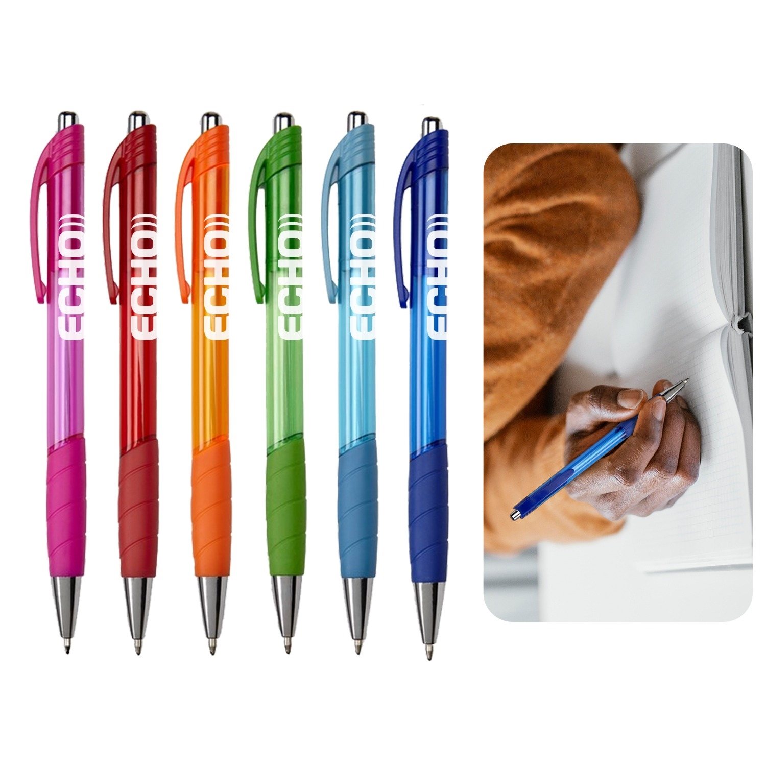 - This click pen with pocket clip and rubber grip writes in black ink with medium point.