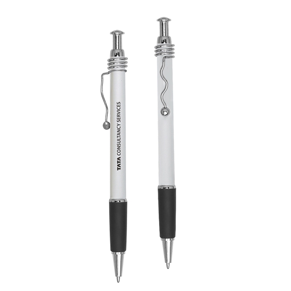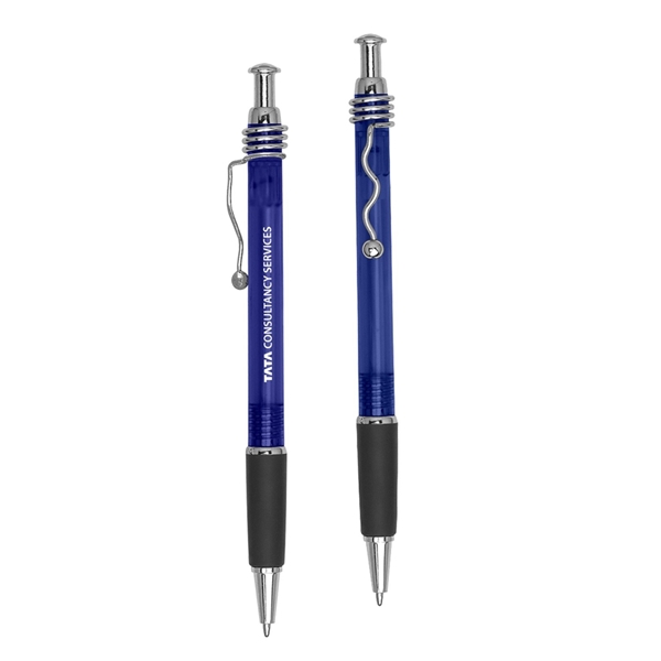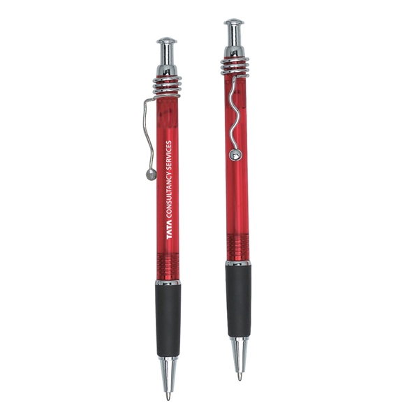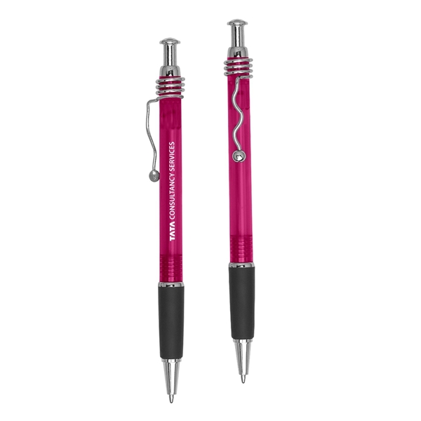 - This click pen writes in black ink, includes a rubber comfort grip, as well as a curvey shaped pocket clip.