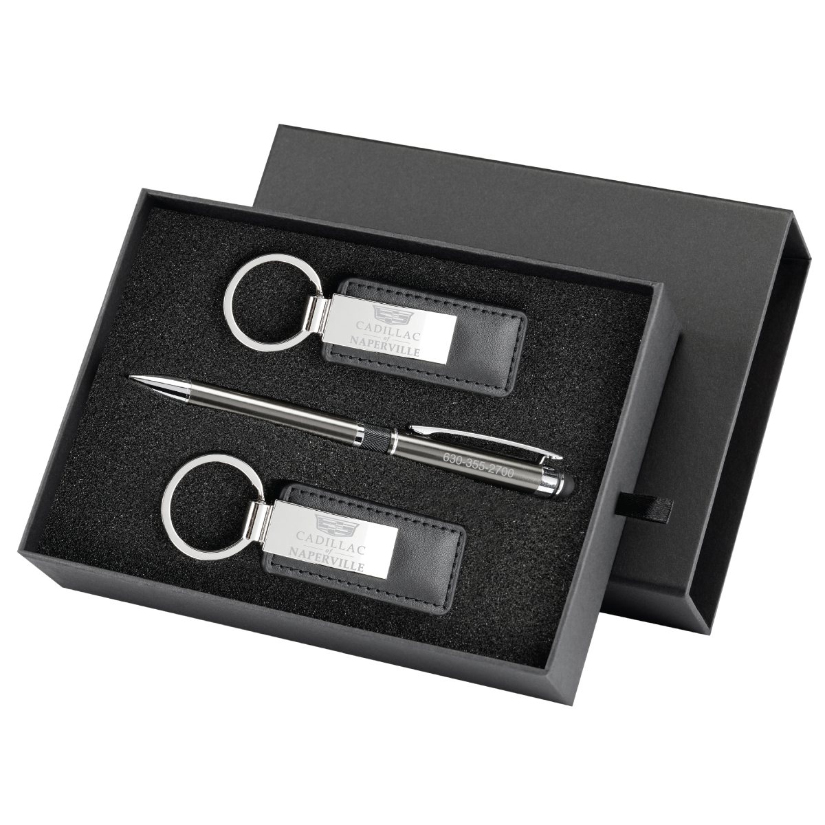 Heavy duty cardboard gift box includes a soft touch capacitive stylus, two leather and silver chrome plated keyring and engraving on all three items