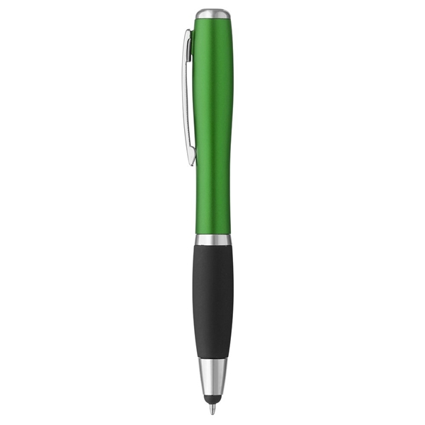 - Everyone's favorite curvaceous ballpoint stylus pen; now with a brightLED flashlight tip! Rich jewel tone color barrel; shiny silver accents; rubber grip and soft cushion capacitive tip stylus designed to mimic your finger and keep your touchscreen fingerprint free! Comes with black ink, requires (3) AG3 batteries (included).