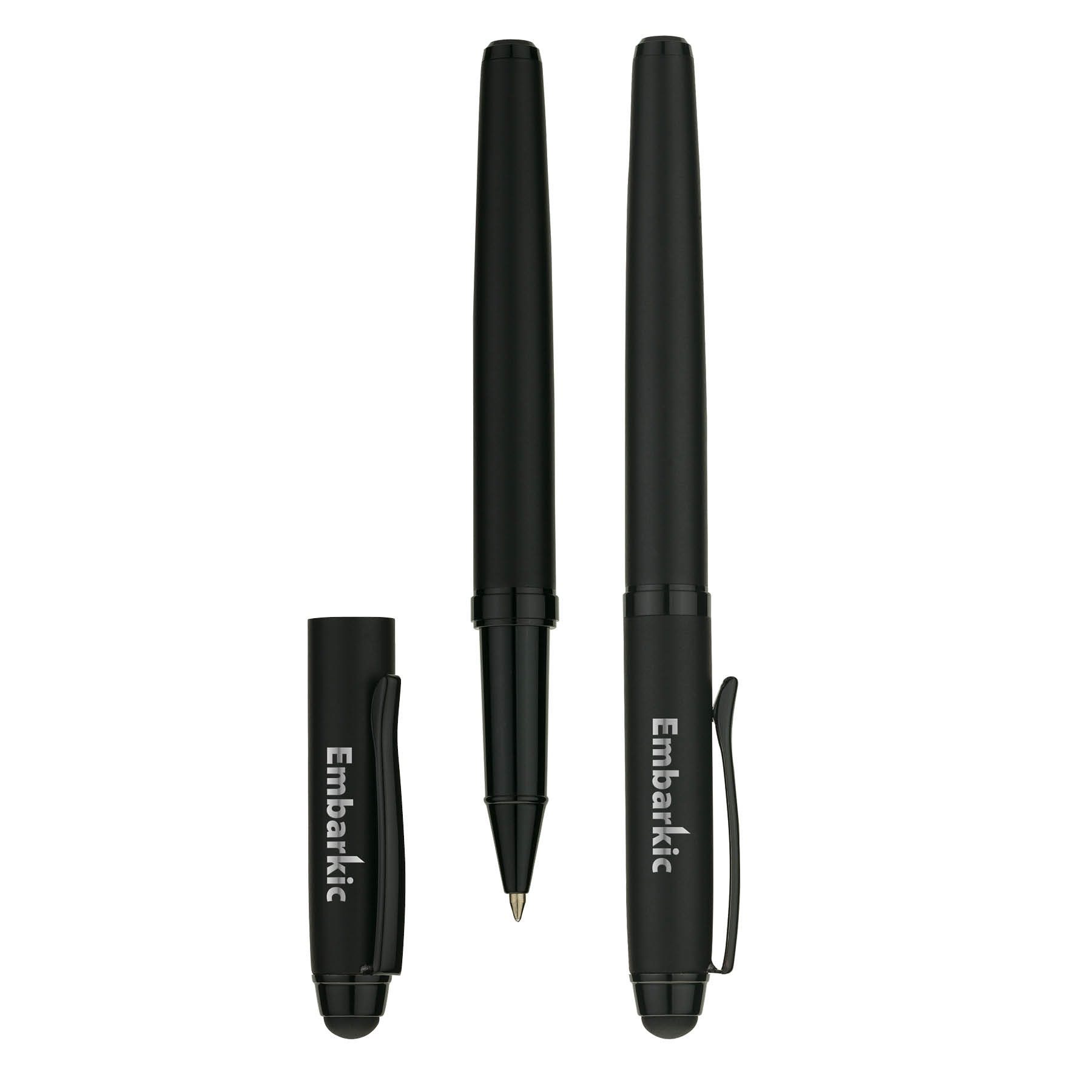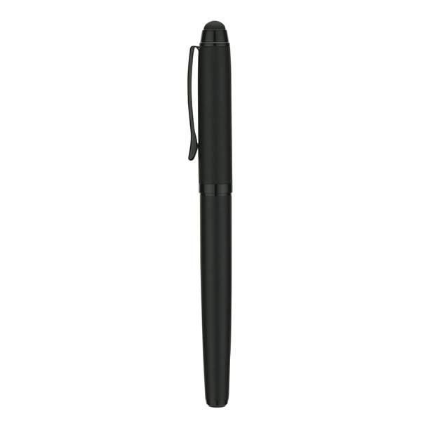 The Zest brass and stainless steel rollerball pen has a classic cap-off design, matte black finish, gloss black clip and trims, and a capacitive stylus that works with touch screen devices.