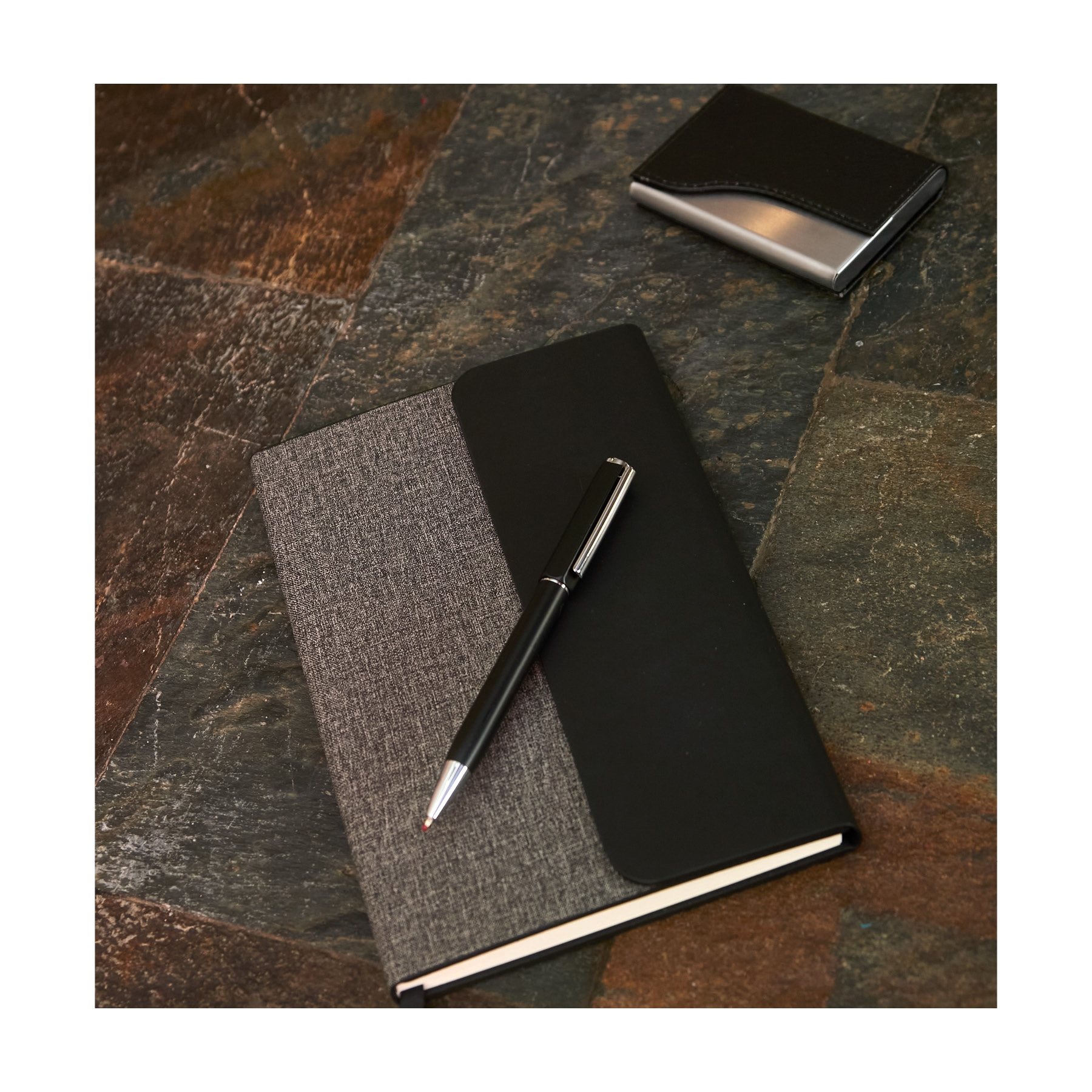 Completing the set is a metal and textured leatherette business card case, adding professionalism to your essentials.