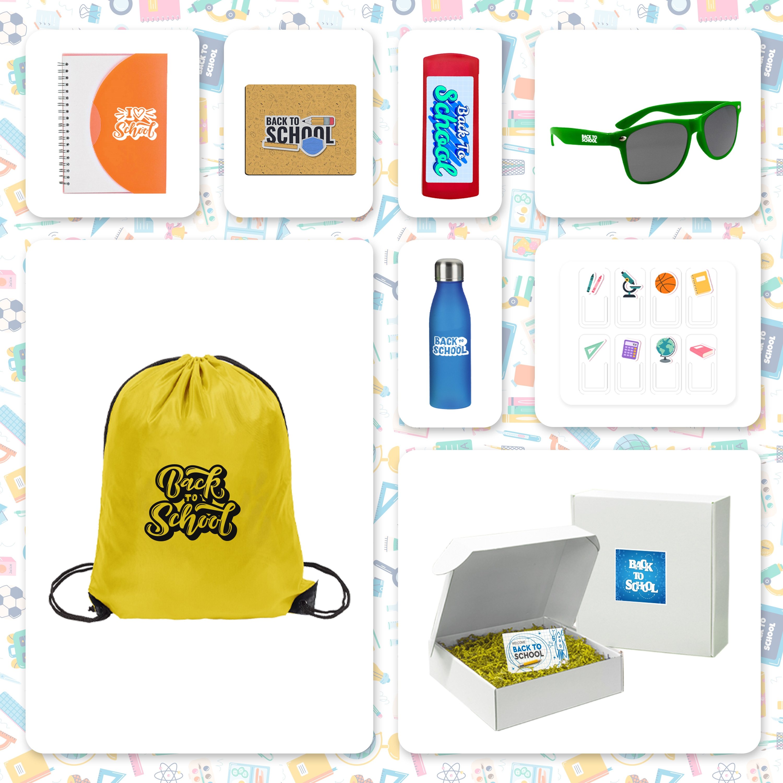 Backpack: 14"w x 18"h, Bottle: 9.5"h x 2.75" dia., Notebook: 4.1"w x 5.3"h, Sunglasses: One Size Fits All, Mousepad: 8"w x 6 ½"h x 1/8", Bandage Dispenser: 4"w x 1.5"h, Page Grabbers: 7"w x 4"h, Box: 12.25"w x 13"l x 4"h