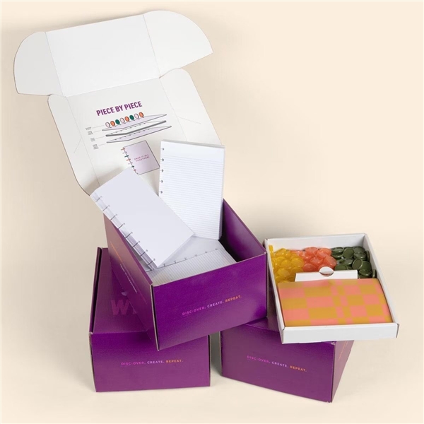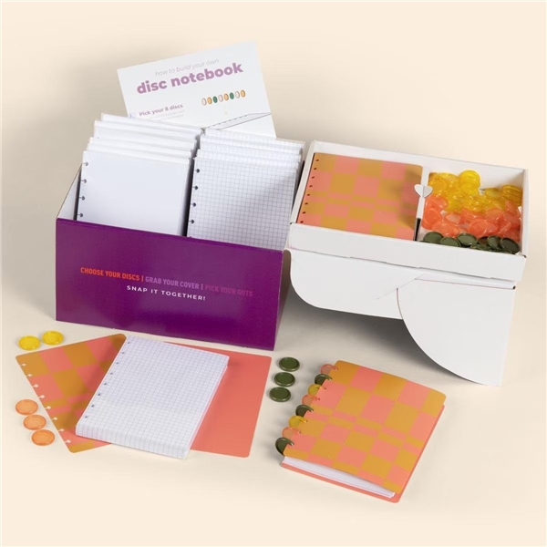 Inside each box, you’ve got everything needed to create 12 junior disc notebooks that people actually get to assemble themselves.