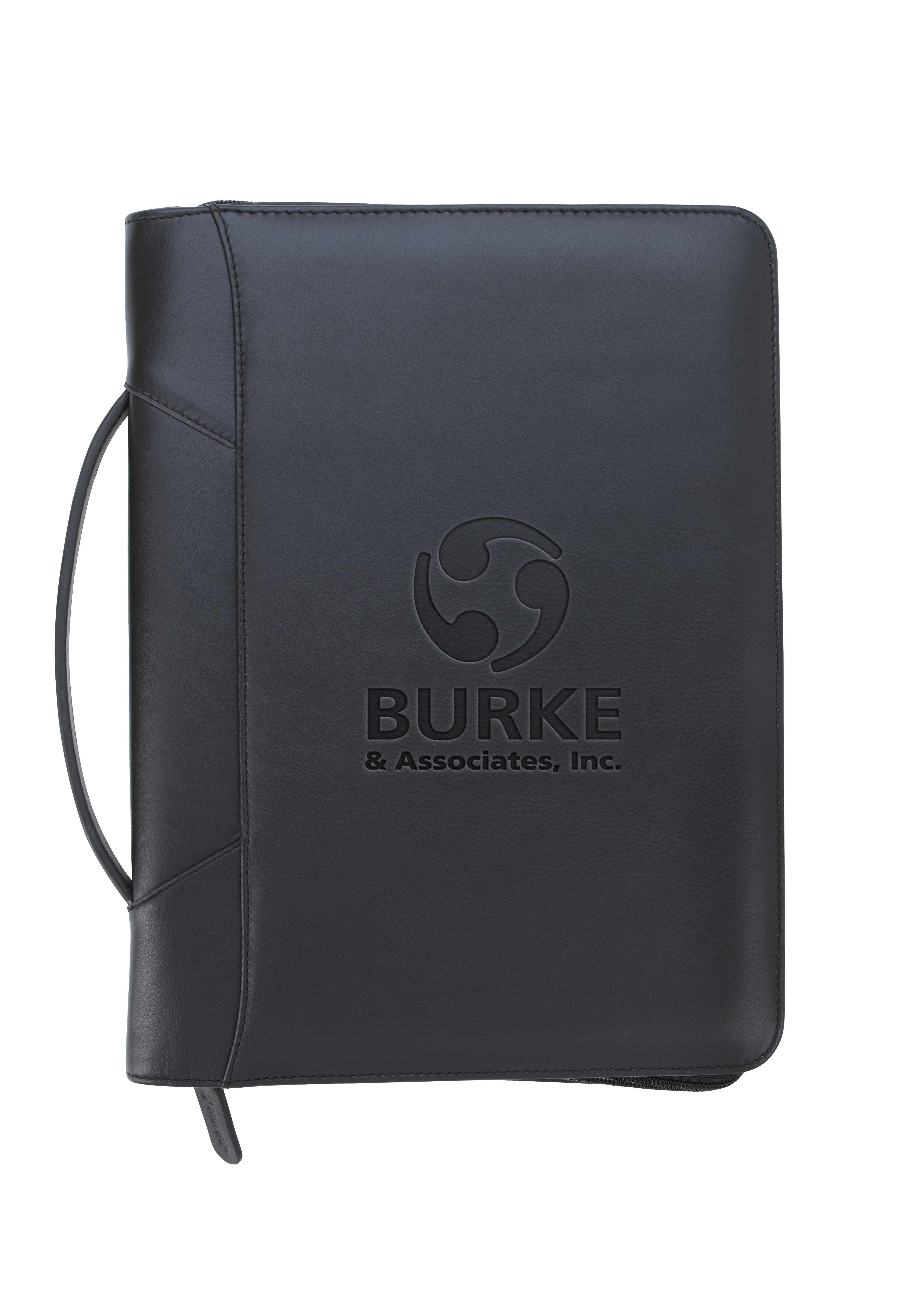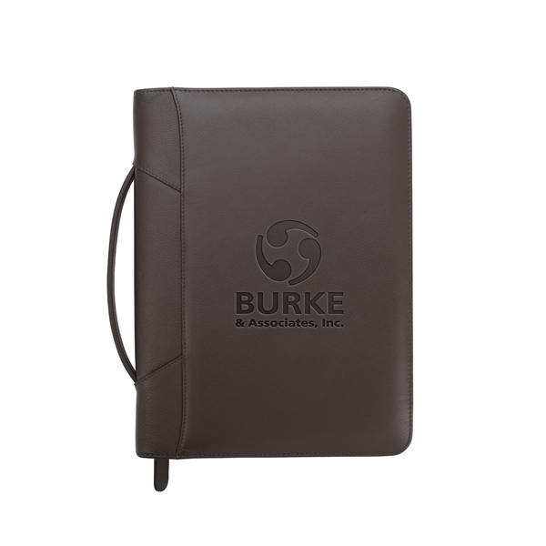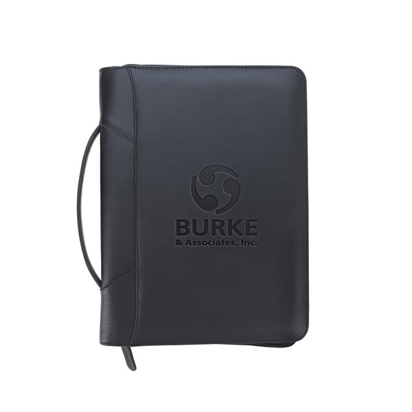 Stay organized and make a lasting impression with this premium leather zippered padfolio. Designed with a built-in handle and sleek leather pulls, it combines professional style with everyday function. The cotton-lined interior features a tablet pocket, phone stand, zip and card storage, elastic bands for cables, and a detachable 3-ring binder with an FSC-certified notepad. From meetings to on-the-go productivity, this padfolio is crafted to perform as beautifully as it looks. Because it is a natural material, irregularities in the consistency of this product’s leather are inherent to its natural beauty and personality.