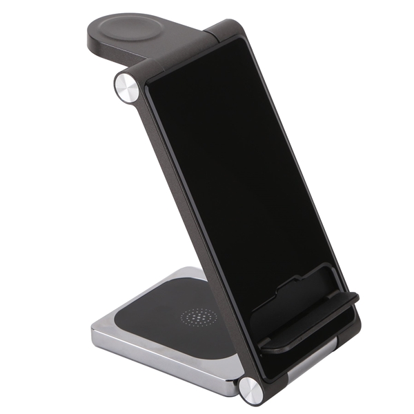 The compact design folds flat for storage and then opens to a stand, shelf and pad – exposing 3 wireless charging surfaces at one time.