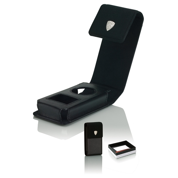 Sleek leather exterior and suide-like interior, standard MP3 screen and button windows, flip-down magnetic closure, slim snap belt clip.