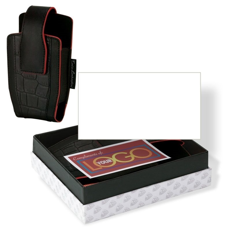 Crocodile-embossed polished leather, luxurious black velvet lining and red trim, magnetic flap clsoure, elastic sides and belt clip.