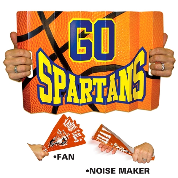 A three in one product: Banner/rally sign, noise maker and fan combined to make an impact at sporting events, marathons, races, schools, campaigns, pep rallies, auctions & concerts.