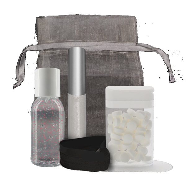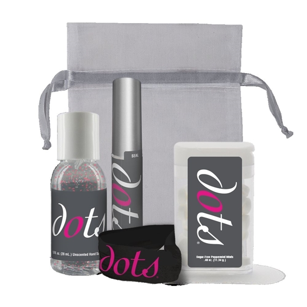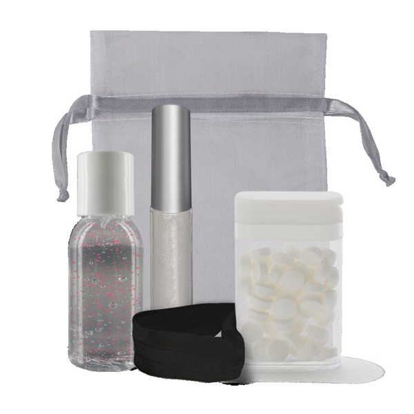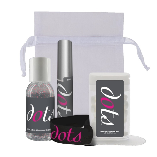 Hair Tie: 3/4" W x 3 7/8" L, Mint: 1 1/2" W x 2 1/2" H x 5/8" D, Lip Shine: 4 1/4" H x 1/2" Dia, Bag: 4 7/8" W x 6 7/8" H, Sanitizer: 3 1/8" H x 1 1/4" Dia