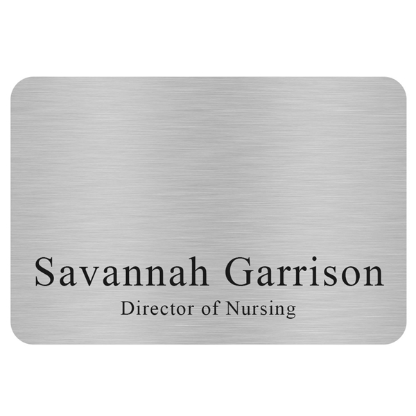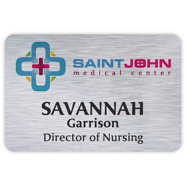 Durability and beauty meet in the Savannah name tag. Featuring sublimated full color graphics on your choice of silver, gold, or white enamel .020 aluminum, this badge gives the beauty of metal with a resilient imprint. Base cost includes a full color imprint, jeweler's pinback, and up to three lines of printed Personalization.