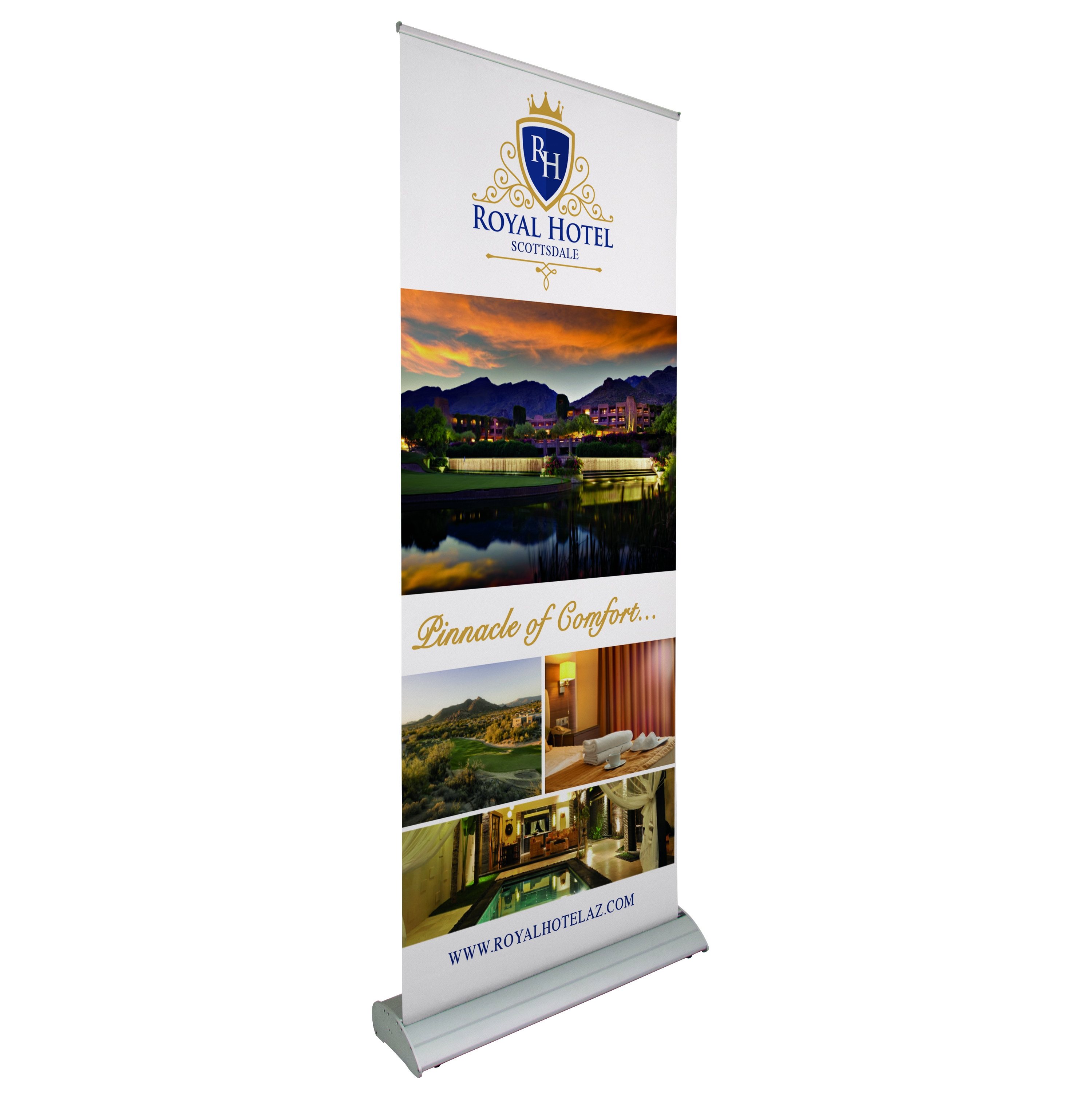 The Deluxe Pro Retractor features a rounded base with durable aluminum end caps, and hook-and-loop fasteners let you swap out banners easily.