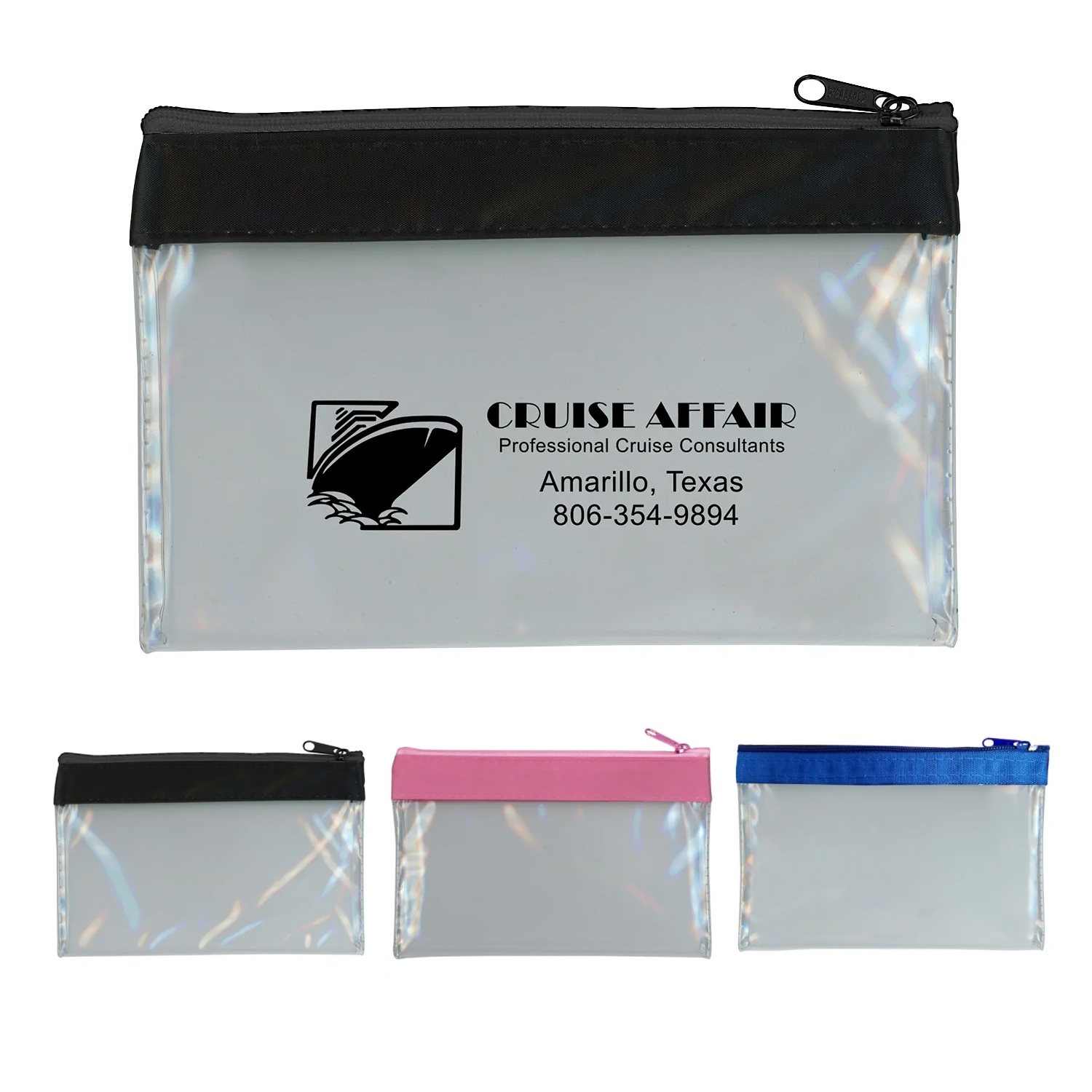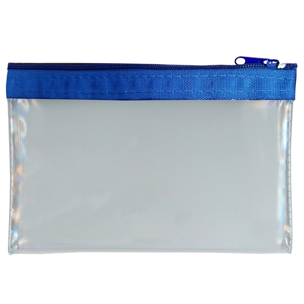 Cosmetic tote bags in crystal clear vinyl with blue zipper and trim.