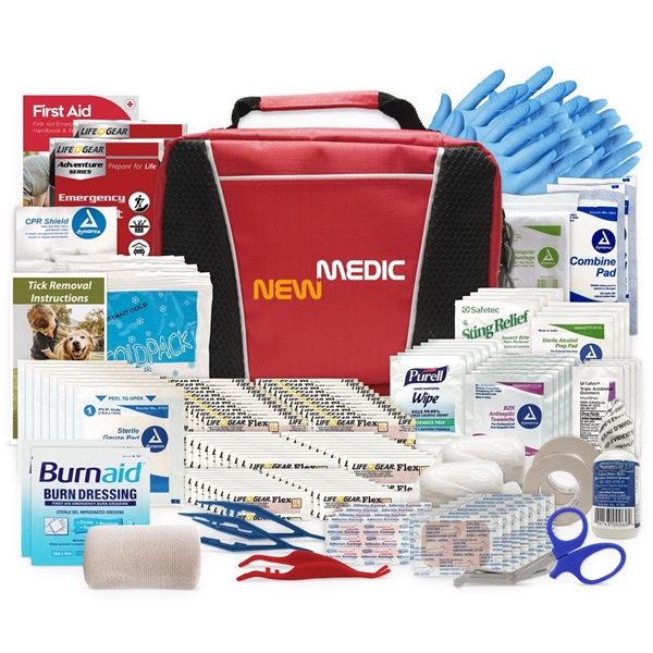Includes: 4 Triple Antibiotic Ointment 0.5g, 2 Burn Dressing 4x4, 1 Eye Wash 1 oz , 6 Purell Anti-Bacterial Wipe, 2 Ab Pad 5" x 9", 4 Sting Swabs, 1 Tick Tool Tweezer Combo, 1 Tick Removal Instructions, 1 Triangular Bandage, 2 Emergency Blanket Thermal Reflective Mylar, 1 CPR Mask 1 Way Valve, 2 Roller Gauze 2", 6 Nitrile Gloves, 3 Blister Bandage 1.5" x 1.5", 1 Elastic Bandage - 3" x 2 Yard Latex Free, 3 Ice Pack - Instant 5" x 6", 1 EMT Shears, 1 First Aid Comprehensive Emergency Manual, 24 Flex-Fit Bandages 3/4" x 3", 40 Junior Bandage 3/8 x 1.5, 4 Alcohol Prep Pads, 8 BZK Antiseptic Wipes, 4 Bandages - Specialty Knuckle, 4 Flex-Fit Large Patch Bandages - 2" x 3", 2 Tweezers, 8 Gauze Pads - 3" x 3" Sterile, 2 Medical Tape 1/2" x 5 Yard