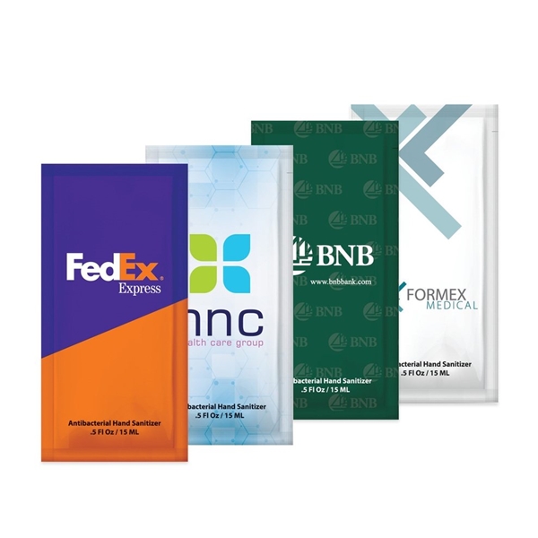 - Perfect item to keep your brand visible to those people on the go. Convenient half-ounce hand sanitizer gel pack is perfect in purses, pockets, travel bags and glove compartments for those “need sanitizer now” moments. Have them reach for your brand. Cover the entire packet with your logo, brand message and theme. The 62% ethyl alcohol formula kills 99.9% of germs, plus moisturizing aloe leaves skin soft with no sticky residue. Made in America.