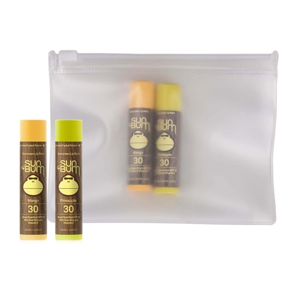 Kit includes two Sun Bum lip balm (flavors Pineapple and Mango) packed and branded in a biodegradable pouch.