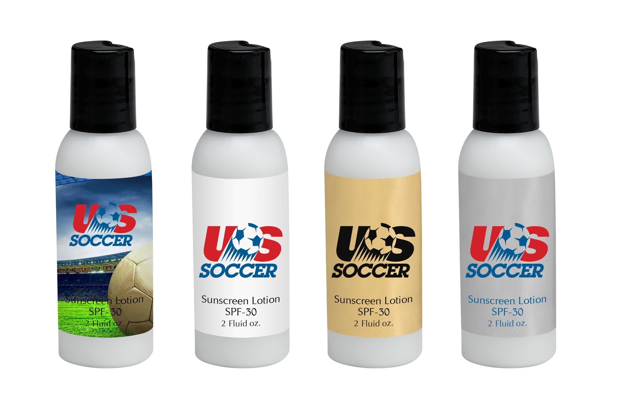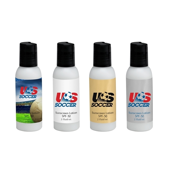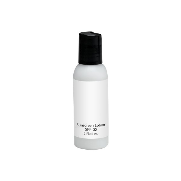 SPF30 Sunscreen in translucent 2 oz bottles.